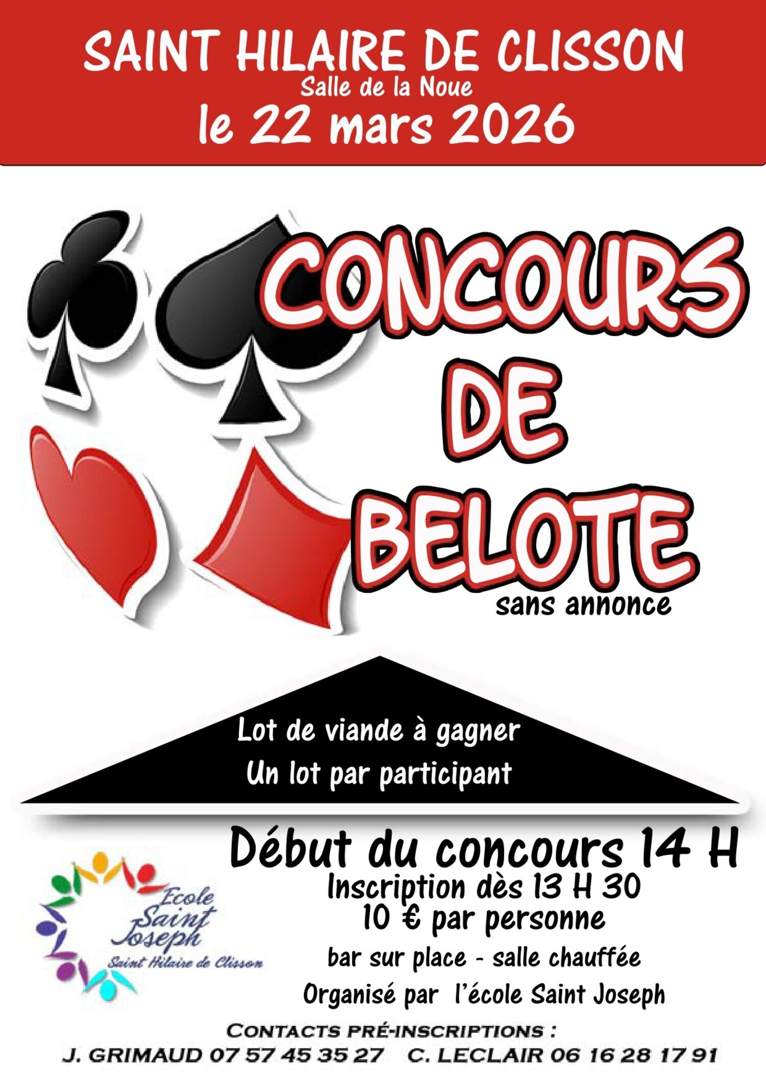 Concours de belotesports et loisirs publié le 22-03-2026 22marsorganisé par l'école Saint Joseph Inscription dès 13h30retour