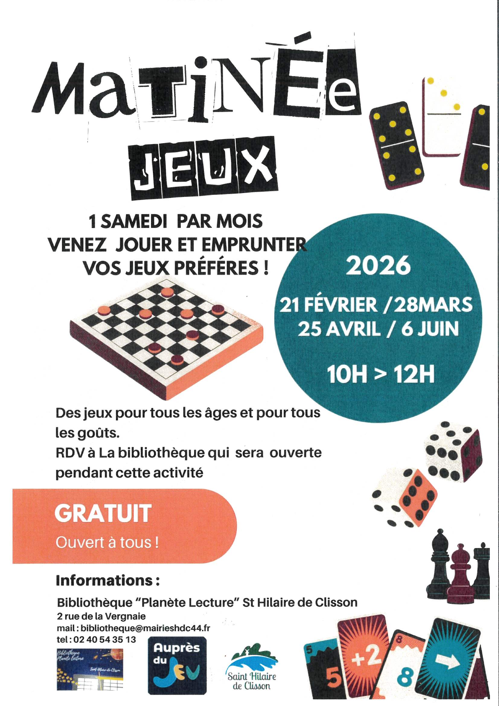 Matinée jeux vie locale,sports et loisirs publié le 25-04-2026 25avrilVenez jouer et emprunter vos jeux préférés à la Bibliothèque de 10h à 12hretour