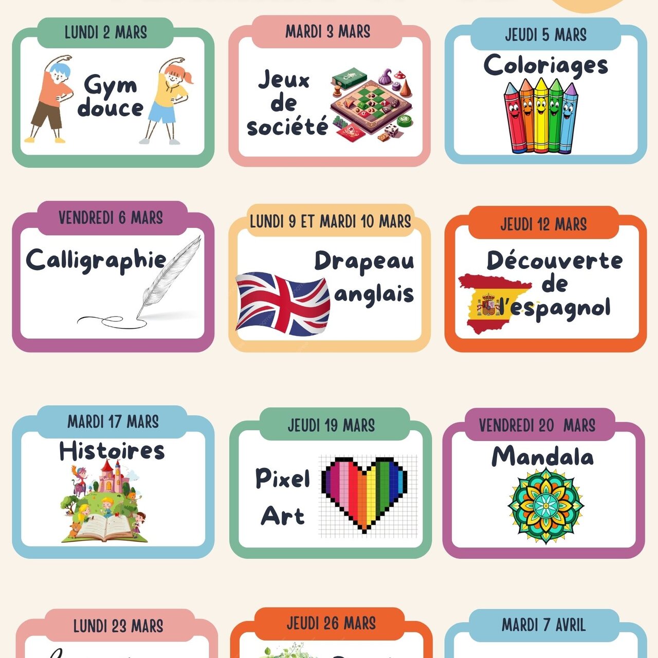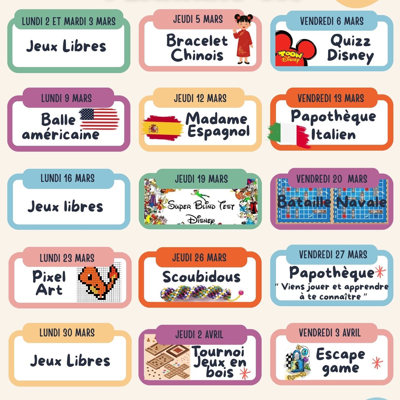 Des animations sont proposées par l’équipe d’animation sur le temps de récréation, tout au long de l’année en fonction des repas thématiques mais aussi des envies des enfants.